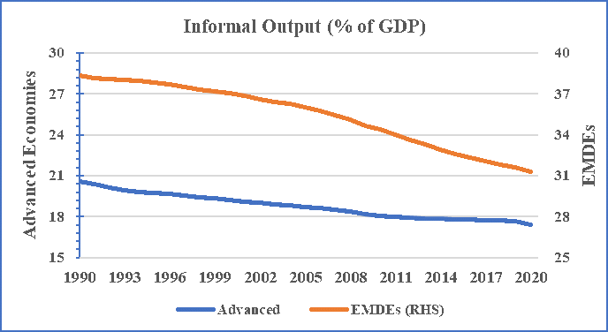 Identifying the importance of their economic contribution and in order to bridge the overall productivity gap, firm and employment formalization has been at the forefront of country’s economic agenda. Through its multipronged approach and under its “Digital India” program which started in 2015, the government has been focussing on easing out the business registration process (UDYAM portal, 2020), facilitating efficient digital infrastructure (UPI in 2016, GST in 2017) and enhancing market access (GeM portal for MSMEs, 2017) for informal businesses. These formalisation initiatives are further linked to improved financial access and higher social security benefits to informal workers. Globally, the share of informal economy has been declining, more steeply for emerging markets and developing economies (EMDEs) as shown vide Figure 1 and 2.
